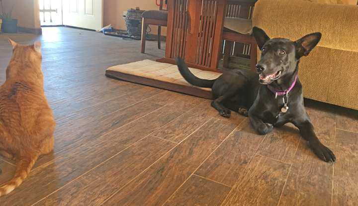Pepper is cat reactive. If she’s behind a baby gate or in the yard she lays, watches and whines while they do their thing. If she’s in the house with them, they are her entire focus; she tracks them constantly. Not something the cats enjoy….as you can imagine. Pepper is a foster dog, I’m training to be a a psychiatric service dog. Unfortunately, reactivity of any kind cannot be a part of a service dogs life, so if I cannot break her of this, she may have to go back to the shelter.