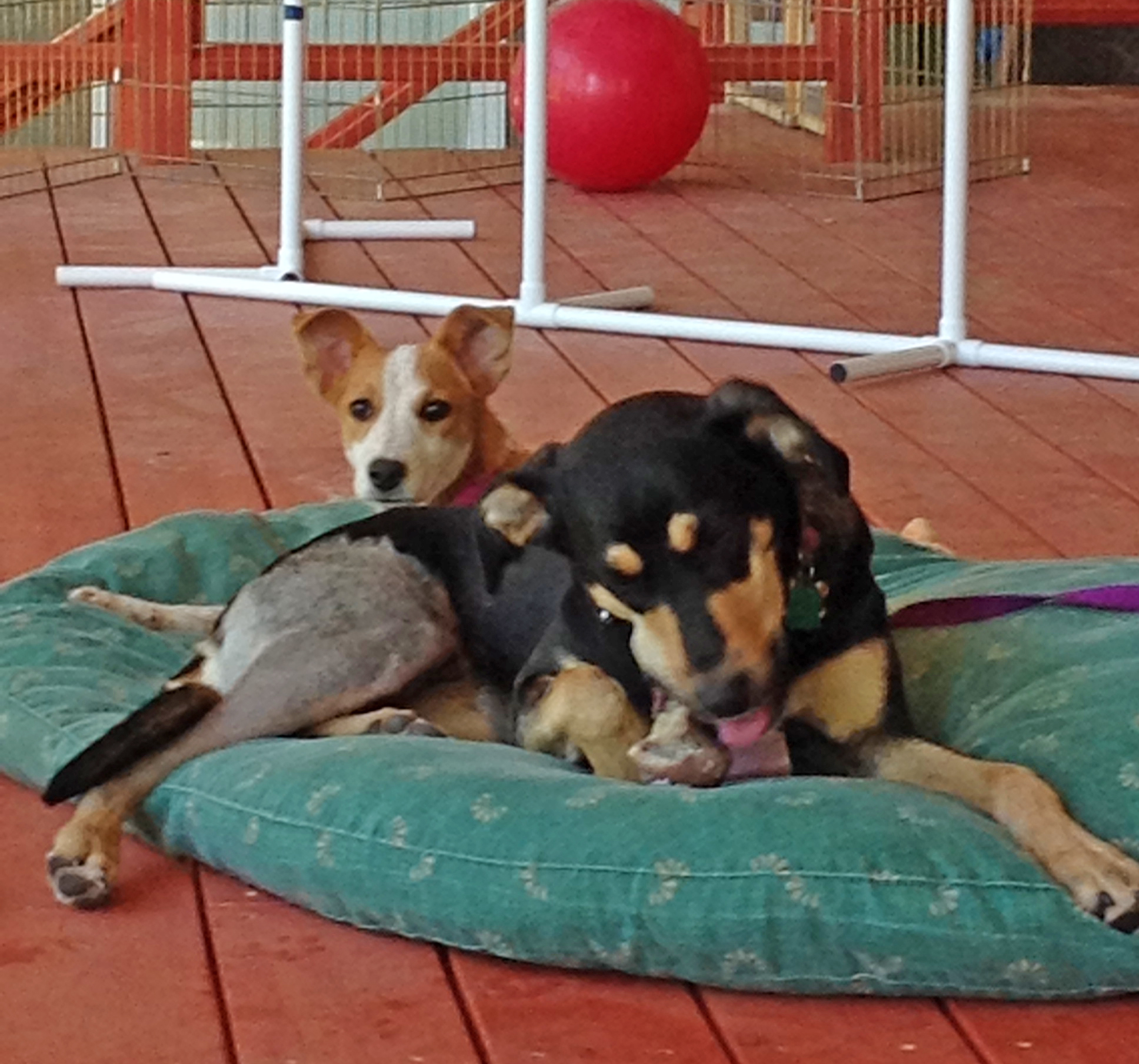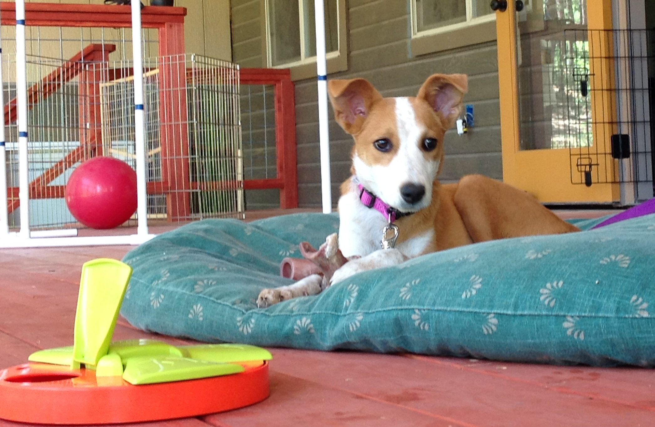 Day 6 – Cried for a while overnight. Put her out in the yard with the gang after breakfast, once I left and most of the kiddos came in she walked around the yard comfortably and finally settled in the sun. When I brought her in, I placed her down half-way up the stairs; showed her what to do for 2 stairs then she did the last three on her own 🙂 Friend came over with dog, she was rude…lunging, barking, baring teeth. He ignored her and she let it go.
