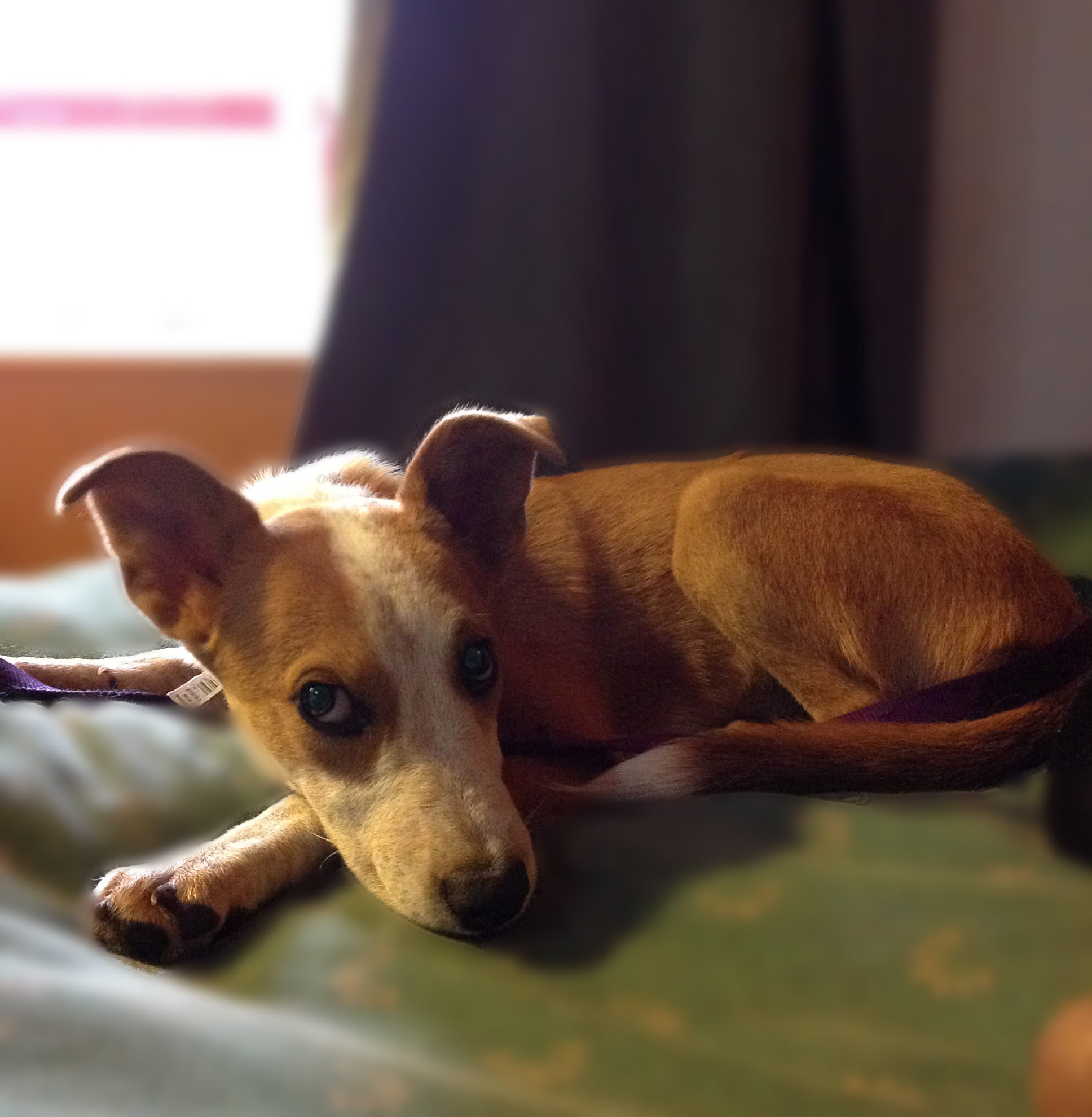 Day 7 – placed her on stairs, half-way down and she continued. Left her in yard when we went for a walk (she won’t walk with me yet) and she figured out the doggie door on her own 🙂 Found her laying upstairs in her favorite bed with one of my shoes…Also indicates that she went up the flight of stairs on her own. She still hasn’t figured out that the stairs to the bedroom are the same so she hasn’t tried them yet, but she’s very excited when we all come down in the mornings.
