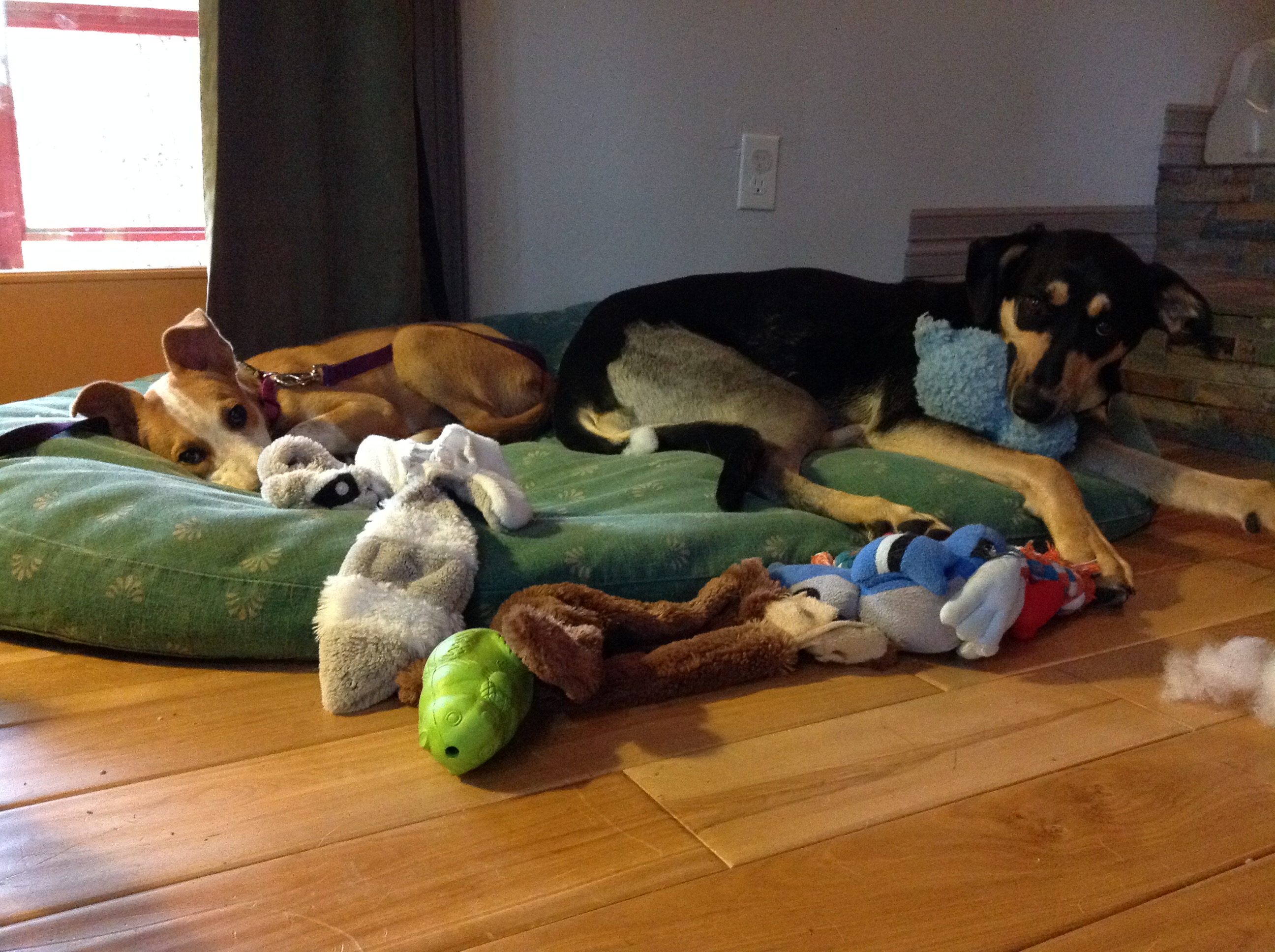 We’re making big strides these days – at least within the confines of her comfort zone 🙂 She’s now going up and down the stairs and in and out of the doggie door…with Mya, but she’s doing it. I also got her to go down the outside stairs today (open-backed so challenging).