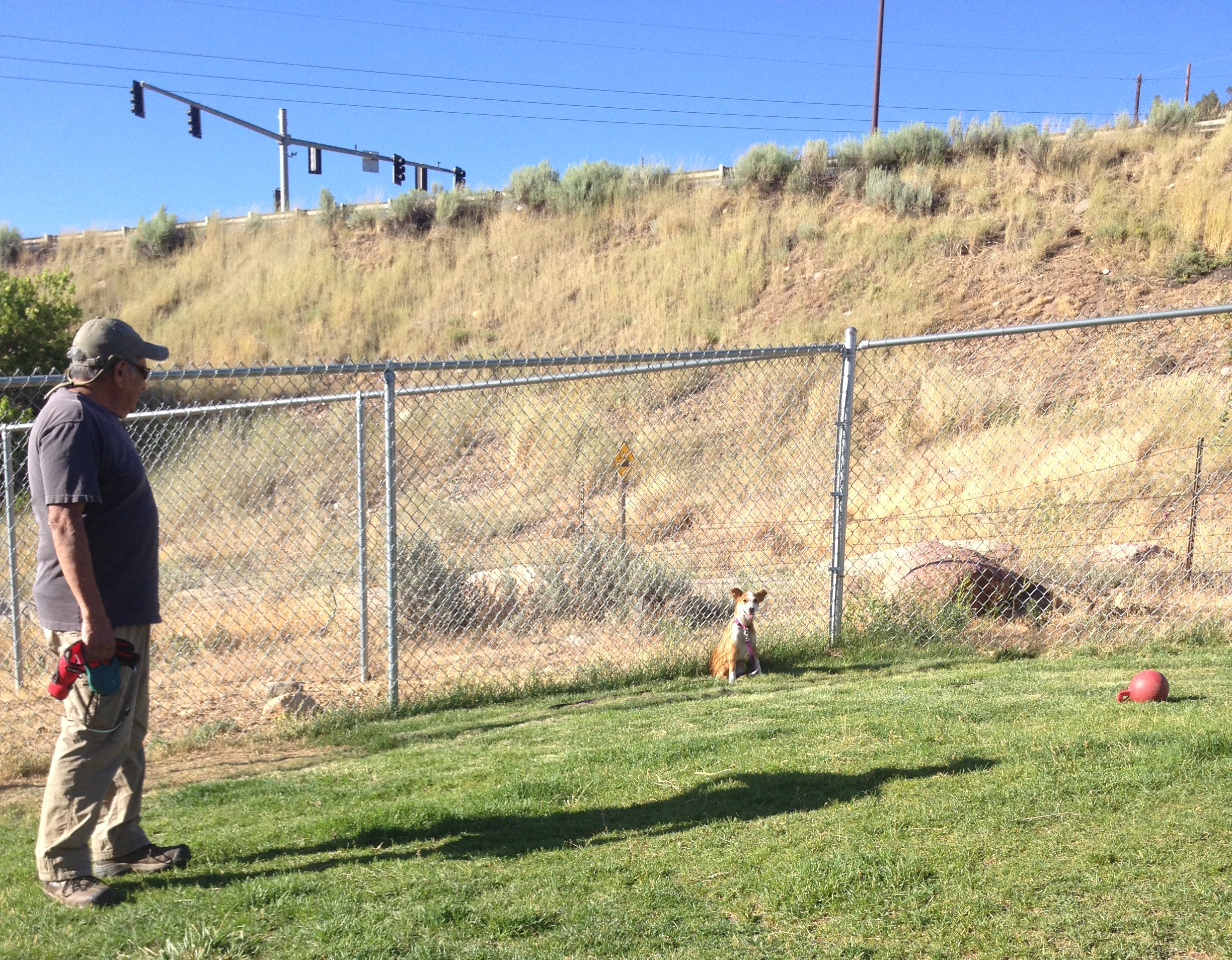 I plan on bringing her back to LPCHS early next week to be put up for adoption but have a few additional issues I’d like worked out before then….1) she still growls anytime a dog approaches, and if she feels trapped she will air snap 2) if I move quickly, her first response is to bolt; if I step on her leash she bolts then turns around and sits facing me – I’d like her to chose the ‘sit down facing me’ without ever bolting option and 3) she’s still very closed down when humans (including me) give her attention -I’d like her to relax just a bit more and enjoy the touch of people.