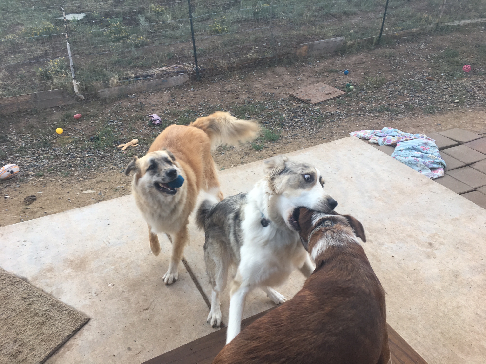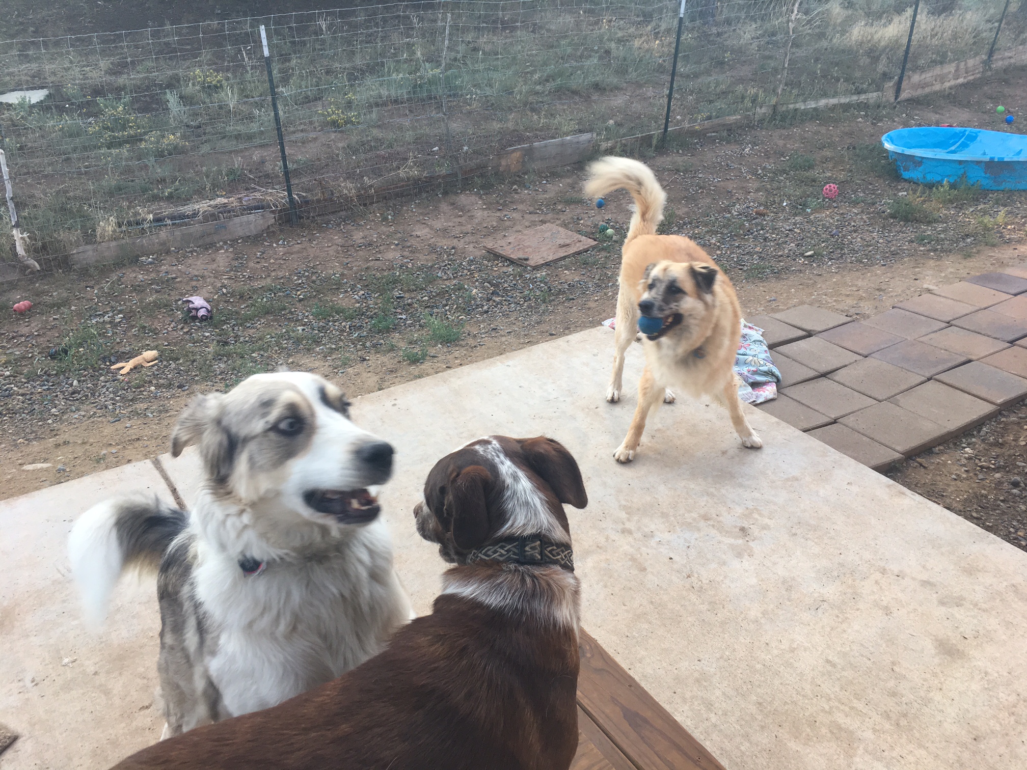 Two dogs will start playing then a third will join in; often this causes a challenge – do the dogs engage with the third? and if so, does the dog who is now left out, take it well? Even in large yards dogs typically play in small groups. A common strategy most dogs employ is to begin barking, escalating the excitement. This is often where stuff goes bad. But one of the best things that can happen is that the third dogs finds something to engage with.
